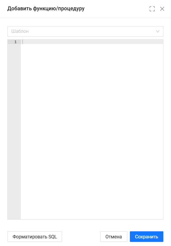 При нажатии на кнопку открывается функциональное окно, где представлена SQL-консоль и раскрывающийся список для подстановки шаблона создания.