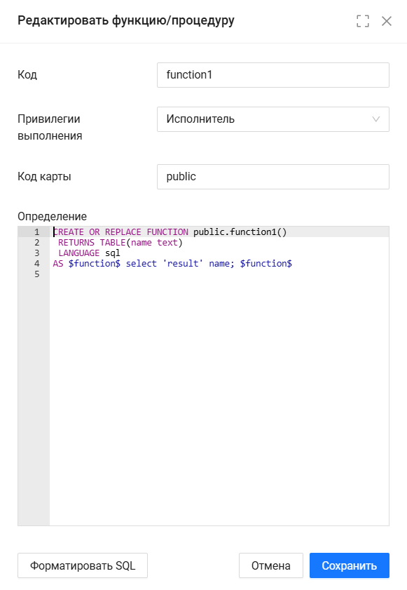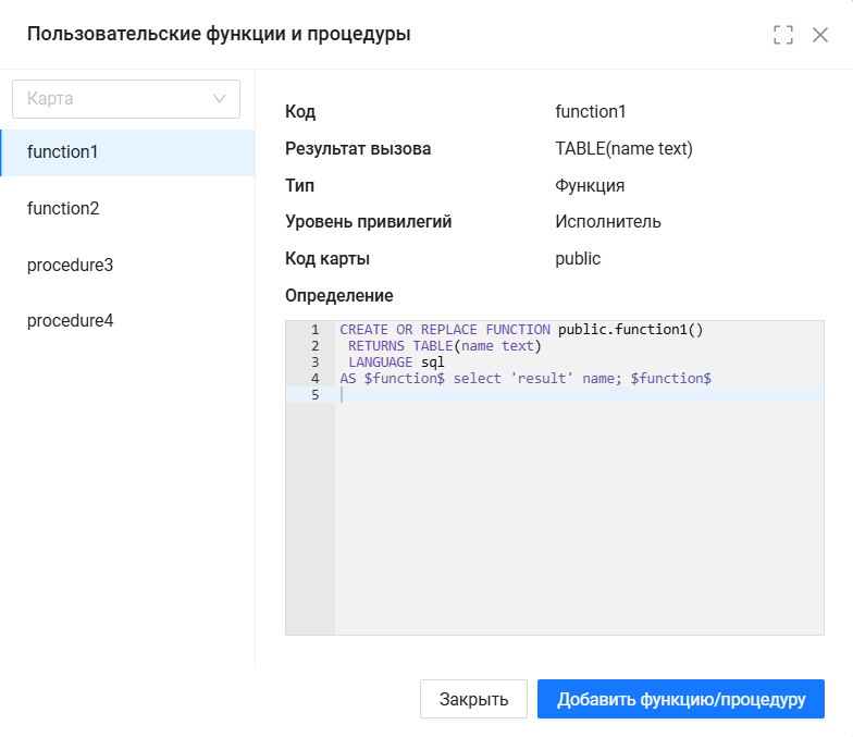 Допускается внесение изменений в созданные ранее функции и процедуры. Для этого необходимо в контекстном меню нужно экземпляра нажать на кнопку . Разрешается редактирование кода функции/процедуры, привелегий ее выполнения и кода карты (схемы-источника).