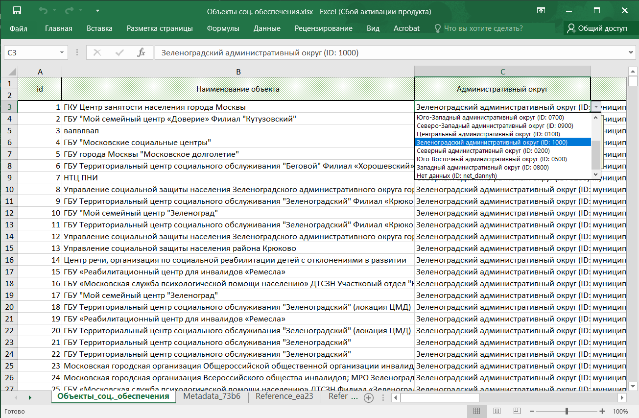 Пример выгруженного слоя в файле Excel со расширенным функционалом выбора справочных значений