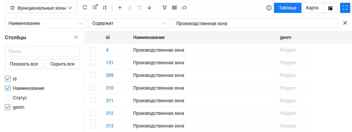 Перечень колонок слоя, которые попадут в файл экспорта, определяется в соответствии с заданными столбцами для отображения таблицы.