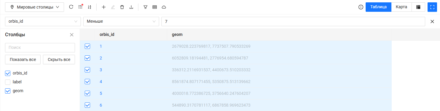 В ORBISmap3 можно экспортировать данные слоя с применением фильтрации по колонкам и объектам.