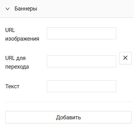 Допустимо использование простого баннера-картинки, которая задается путем указания URL изображения с внешнего источника. Также существует возможность указания ссылки для перехода на другой ресурс при клике на баннер. Для этого требуется в настройках публикации указать URL для перехода. При необходимости можно добавить некоторый текст, который будет размещен под или вместо картинки баннера. Разрешено добавление нескольких баннеров.