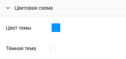 Элемент Цвет темы позволяет выбрать цвет всех основных функциональных элементов (кнопок, чекбоксов) на публичной кате. Переключатель Тёмная тема отвечает за отрисовку панелей и информационных окон в темном цвете.