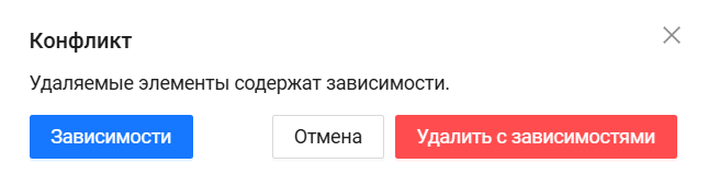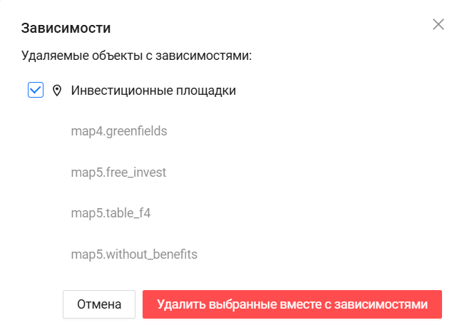 При нажатии на кнопку открывается информационное окно, в котором будут перечислены все зависимые от выбранной таблицы сущности с указанием их полного кода (код_карты.код_сущности). При удалении нескольких таблиц в данной форме будет представлен перечень зависимостей по всем конфликтным таблицам.